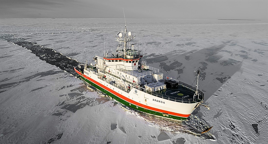 Merentutkimusalus Aranda lipuu laituriin Helsingissä. Alus on ympäristökeskuksen hallinnoima laiva, joka on suunniteltu erityisesti Itämeren tutkimukseen, mutta alus on vieraillut tutkimusmatkoillaan mm. Etelämantereella ja Jäämerellä.
