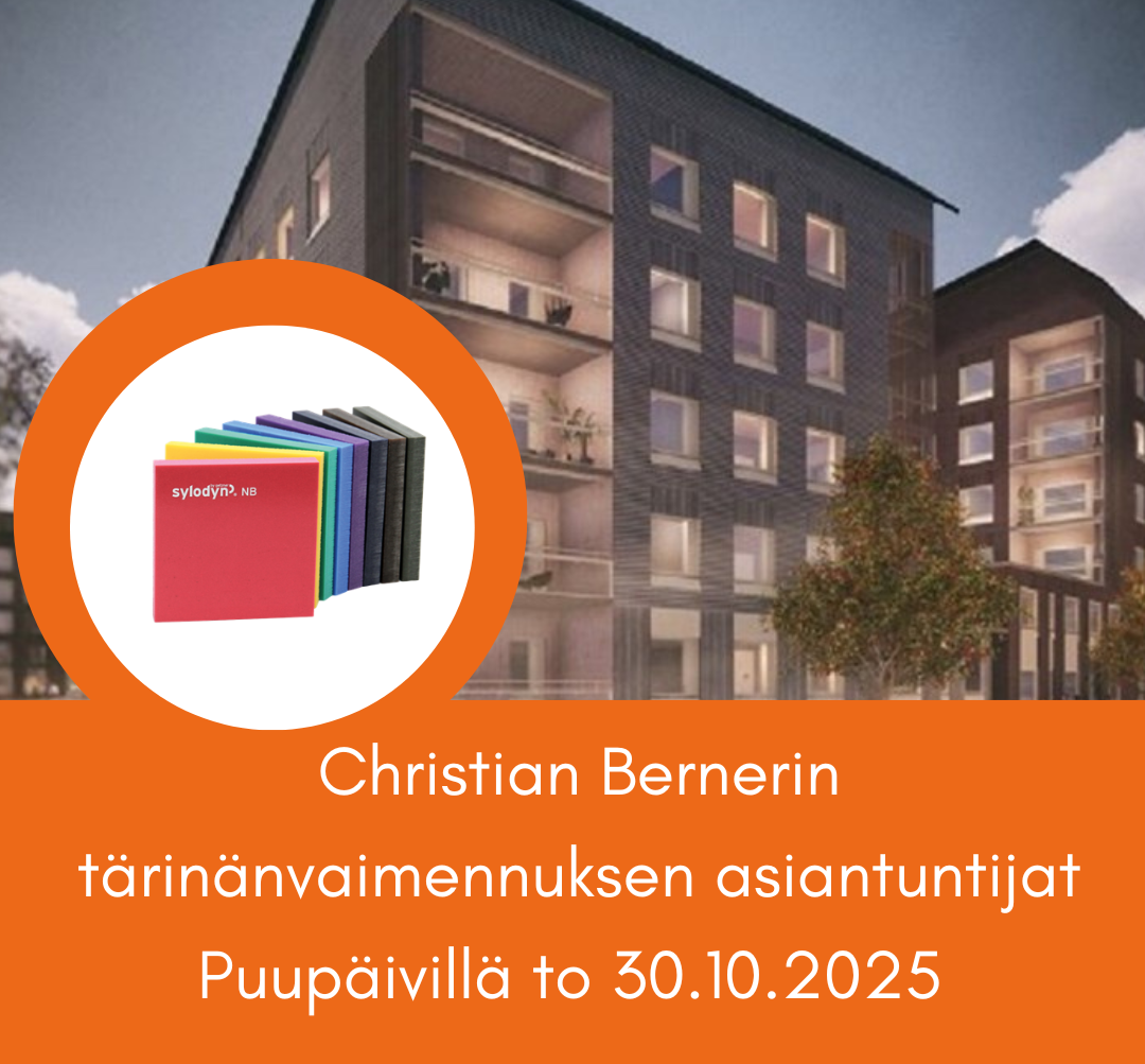Me luomme hiljaisia ympäristöjä. Puupäivillä on mukana Christian Bernerin tärinäneristämisen tiimi. Tervetuloa tapaamaan asiantuntijoita ständillemme. Voit sopia tapaamisen myös ennakkoon.
